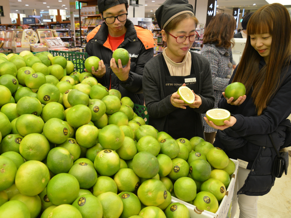 롯데백화점 부산본점 지하 1층 식품관에서는 미국산 초록자몽을 대거 선보여 고객들이 살펴보고 있다. 이 상품은 크기에 따라 4개 또는 6개당 1만원에 판매되고 있다. (사진제공=롯데백화점 부산본점)