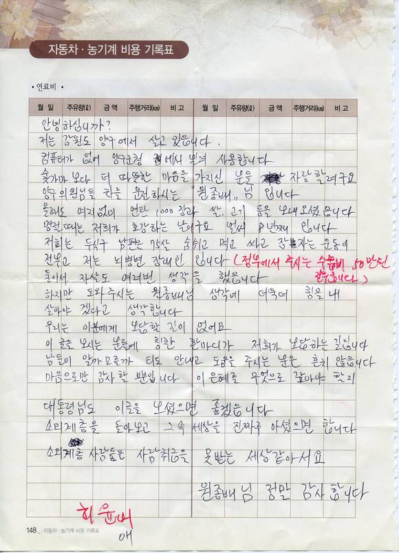 또 고마운 마음은 이루 다 말할 수 없지만 보답할 길이 없어 고민하다가 칭찬의 한마디가 능력으로 할 수 있는 유일한 보답의 길이라고 생각돼 이렇게 편지로나마 소식을 전하게 됐다고 덧붙였다.
