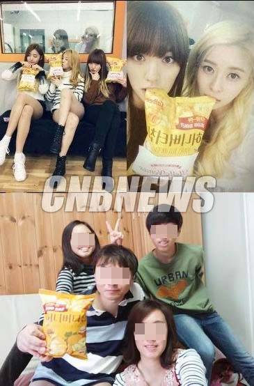 ▲허너버터칩 열풍이 불면서 일반인, 유명인 가릴 것 없이 SNS에 인증샷을 올리는 게 유행처럼 번지고 있다. 지난 4일 걸그룹 헬로비너스가 SNS에 올린 인증샷(위), 일반인 가족이 올린 인증샷(아래). /사진=헬로비너스 SNS, 도기천 기자