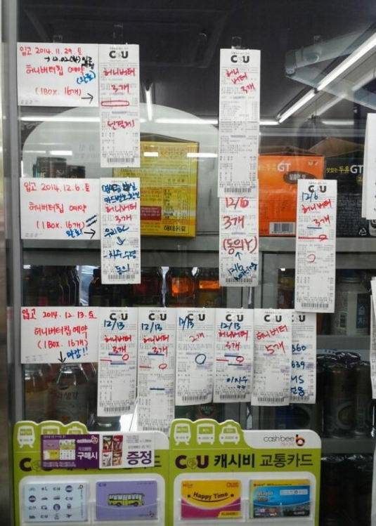 ▲서울시내 어느 ‘CU 편의점’ 유리문에 예약·선결재를 통해 허니버터칩이 매진됐음을 알리는 내역서들이 즐비하게 붙어 있다. (사진=박현준 기자)