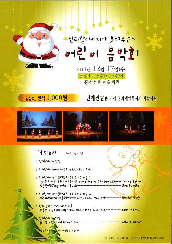 또한 산타 할아버지가 들려주는 크리스마스 캐럴송 및 메들리는 어린이가 쉽게 다가갈 수 있는 이야기와 익숙한 노래들로 구성돼 어린이 관객의 감성을 사로잡으며 꿈과 희망, 용기를 줄 것으로 기대된다.