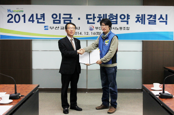 부산교통공사(사장 박종흠)는 노동조합(위원장 이의용)과 16일 오전 부산진구 범천동 소재 본사에서 공사 사장 및 노동조합 위원장이 참석한 가운데, 2014년 단체교섭 및 임금협약 체결식을 갖고 5개월에 걸친 노사협상을 마무리했다고 밝혔다.