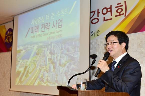 염태영 수원시장이 지난 16일 오후 수원의 한 호텔에서 열린 경기언론인 특강에서 민선6기 사람중심 더 큰 수원의 미래전략을 제시했다.