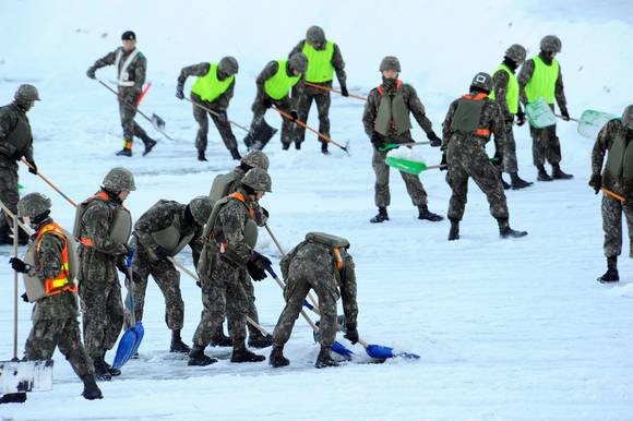 군에 따르면 노도부대 공병부대와 빙상장 인근 군부대 장병들과 함께 15㎝가량 눈 덮인 빙상장을 깨끗하게 치워 빙상장의 면모를 갖췄다.