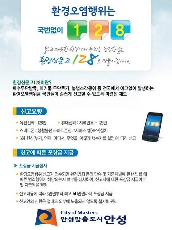 안성시가 환경오염행위를 시민들이 손쉽게 신고할 수 있도록 ‘환경신문고 128’을 운영해 환경민원을 해소하고 있다.