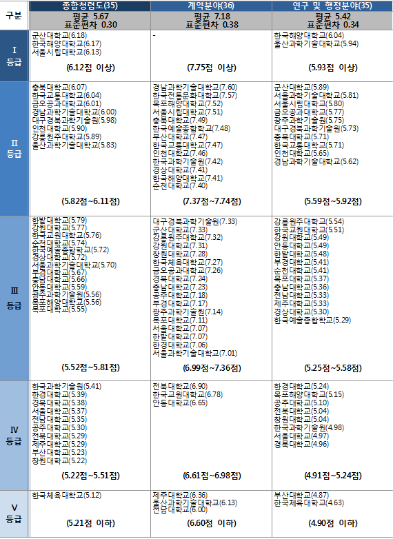 또다른 부산·경남 지역 국·공립대학중 경상대(5.72점), 부경대(5.67점)는 3등급, 부산대(5.23점), 창원대(5.22점)는 4등급을 받았다.