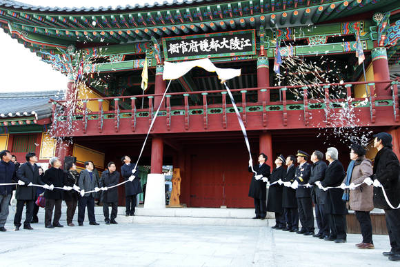 ▲▲ (CNB=최성락 기자) 강릉시는 18일 사적 제388호인 강릉 임영관의 지정 명칭이 문화재청 문화재위원회의 심의를 거쳐 '강릉 대도호부 관아'로 변경됨에 따라 명주동 강릉대도호부 관아에서 최명희 시장과 이용기 시의장 등을 비롯한 시민 200여 명이 참석한 가운데 현판식을 가졌다.
