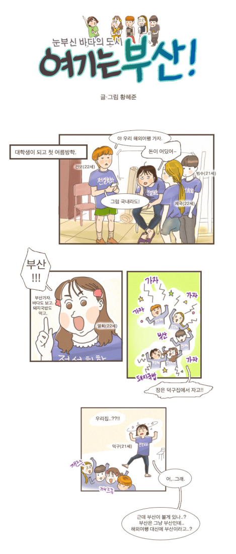 황씨는 부산에서 나고 자라 서울로 대학을 가 고향을 떠나있었다. 과거 회상 장면에서 시작해, 친구들과 부산을 여행하며 주인공은 부산을 새롭게 인식하게 된다. 특히, 부산에서의 추억을 과거와 현재를 넘나들며 구성한 스토리텔링 구조에 창의성이 넘치며, 뛰어난 그림 실력과 치밀한 연출력이 단연 돋보인다는 평가를 받았다.