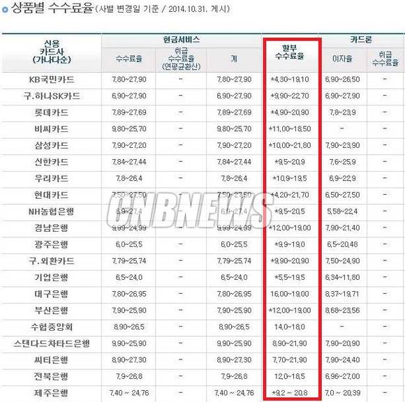 ▲여신협회가 최근 공개한 ‘카드사 상품별 수수요율’(10.31기준). 카드사들은 평균 15%안팎의 할부이자수수료를 챙기고 있는데, 이는 은행들의 신용대출 금리가 4~5%대인 것을 감안하면 3배 가까이 이자 폭리를 취하고 있는 셈이다.