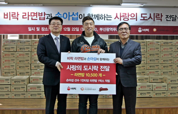 ‘사랑의 도시락’은 손아섭 선수가 안타 1개를 칠 때마다 비락 라면밥 10박스가 적립되는 형태로 진행됐으며, 올 시즌 총 175개의 안타를 친 손 선수의 기록에 따라 1750박스의 라면밥을 부산광역푸드뱅크에 기부했다.