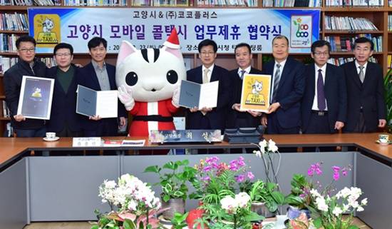 고양시는 23일 시청 타운미팅룸에서 최성 시장과 (주)코코플러스 유용렬 대표가 참석한 가운데 ‘고양시 모바일 안심 브랜드 콜택시 업무제휴 협약서’에 서명했다고 밝혔다.