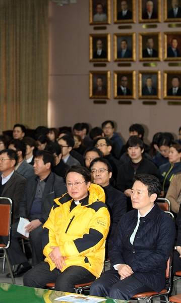 23일 남경필 도지사는 경기도청 제1회의실에 열린 제297회 21세기 희망의 경기포럼에 참석해 김대술 신부(수원다시서기센터 센터장)와 함께 노숙인들이 연극 공연을 관람했다.