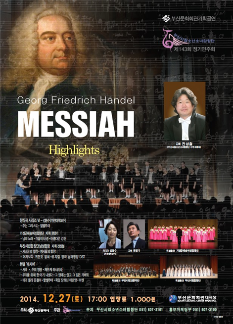 (CNB=최원석 기자) 부산문화회관이 다사다난했던 올해를 마무리하고 송년의 감동을 선사하고자 12월 27일 오후 5시 부산문화회관 대극장에서 기획공연 부산시립소년소녀합창단 제143회 정기연주회 ‘2014 송년음악회 헨델 메시아’를 연다.