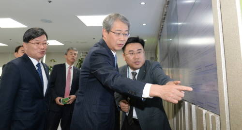▲임종룡 NH농협금융 회장(가운데)이 이달 31일 출범할 통합증권사(NH투자증권) IT본부를 방문해 진행상황을 점검하고 있다.(사진제공=NH농협)