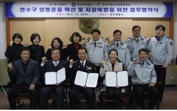 연수구보건소가 지난 24일 연수경찰서에서 연수경찰서, 연수구정신건강증진센터와 함께 ‘생명존중 확산 및 자살 예방을 위한 업무협약’을 체결했다.
