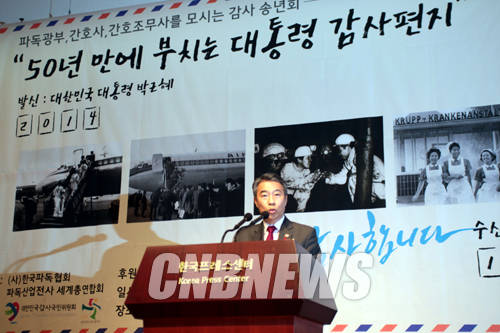 정종섭 행정자치부 장관이 26일 오후 서울 중구 태평로 프레스센터 국제회의장에서 열린 파독 51주년 기념 감사 송년회에서 박근혜 대통령의 편지를 대독하고 있다.