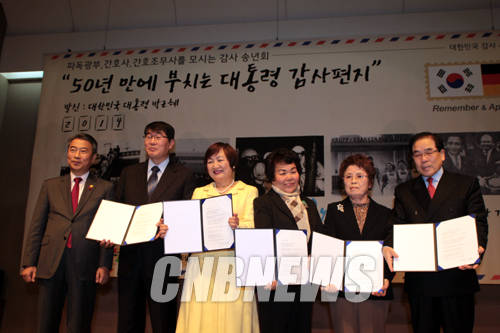 ▲26일 오후 서울 중구 태평로 프레스센터 국제회의장에서 열린 파독 51주년 기념 감사 송년회에서 박근혜 대통령의 편지를 전달 받은 파독 광부, 간호사, 간호조무사 대표들이 편지를 받고 기념촬영을 하고 있다.(사진=왕진오 기자)