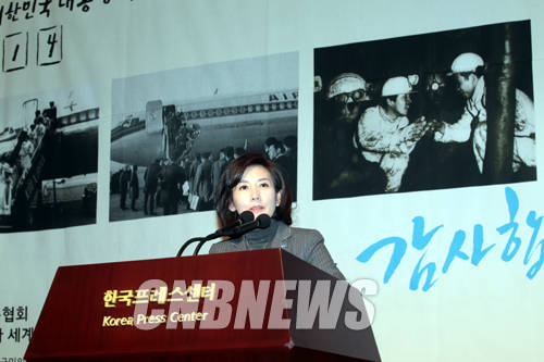 ▲50년 만에 부치는 대통령의 감사편지 감사송년회가 26일 오후 서울 태평로 프레스센터 국제회의장에서 열렸다. 이날 행사에 참석한 나경원 국회의원이 축사를 하고 있다.(사진=왕진오 기자)