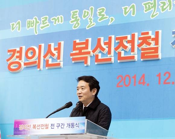 ▲지난 26일 오후 서울 용산역 맞이방에서 열린 "경의선 (문산-용산)복선전철 개통식" 에서 남경필 경기지사가 축사를 하고 있다.(사진=경기도 제공)