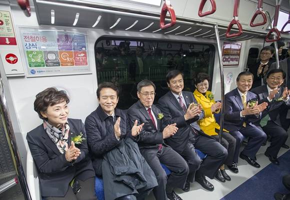 ▲경의선 (문산-용산)복선전철 개통식에서 남경필 경기지사가 용산-공덕 간 시승을 하고 있다.(사진=경기도 제공)
