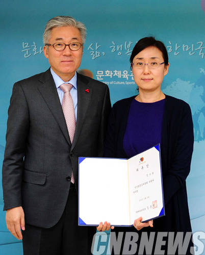 이날 참석한 김종덕 문화체육관광부 장관이 정수완(51) 신임 위원에게 위촉장 수여를 마친 뒤에 기념촬영을 하고 있다.