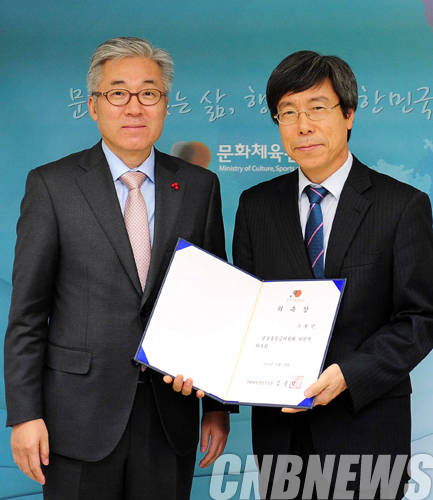 이날 참석한 김종덕 문화체육관광부 장관이 주철안(57) 신임 위원에게 위촉장 수여를 마친 뒤에 기념촬영을 하고 있다.