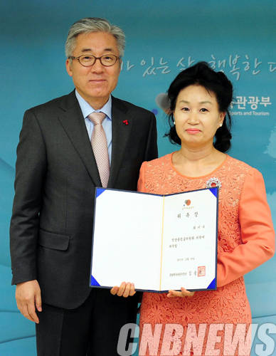 이날 참석한 김종덕 문화체육관광부 장관이 최미숙(55) 신임 위원에게 위촉장 수여를 마친 뒤에 기념촬영을 하고 있다.