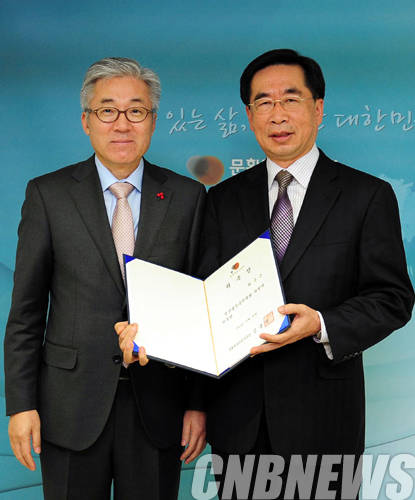 이날 참석한 김종덕 문화체육관광부 장관이 최준근(61) 신임 위원에게 위촉장 수여를 마친 뒤에 기념촬영을 하고 있다.