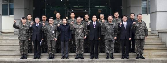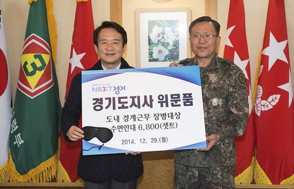 ▲29일 오전 용인 제3야전군사령부를 남경필 경기지사가 위문방문하여 도내 경계근무 장병을 대상으로 수면안대 셋트를 전달하고 기념촬영을 하고 있다.(사진=경기도 제공)