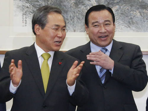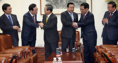 양당 지도부는 이날 오전 10시30분 시작한 회동은 닫힌 문 안쪽에서도 웃음소리가 끊이지 않을 정도로 분위기는 시종 화기애애했으며 불과 10여분간 비공개 대화 끝에 곧바로 종료돼 밝은 표정으로 기자들 앞에 나란히 서서 서로를 치켜세웠다.