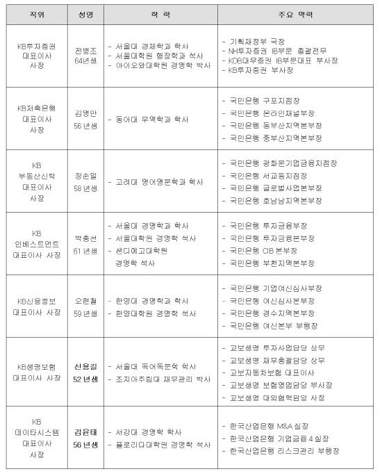 윤종규 KB금융 회장 취임 이래 단행된 첫 인사로 ▲KB투자증권 대표이사 사장 전병조 ▲KB저축은행 대표이사 사장 김영만 ▲KB부동산신탁 대표이사 사장 정순일 ▲KB인베스트먼트 대표이사 사장 박충선 ▲KB신용정보 대표이사 사장 오현철 ▲KB생명보험 대표이사 사장 신용길 등이 각각 선임됐다.