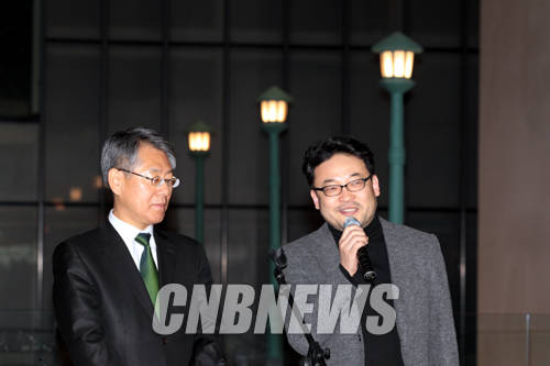 ▲한 해를 마무리하는 특별한 전시와 재즈 보컬리스트 윤희정의 재즈콘서트가 31일 오후 6시 30분부터 서울 종로구 소격동 국립현대미술관 서울관 '박스프로젝트'앞에서 펼쳐졌다. 이날 공연에 앞서 서울관을 설계한 민현준 건축가(사진 우측)가 인사말을 하고 있다.(사진=왕진오 기자)