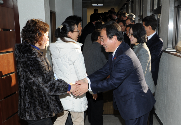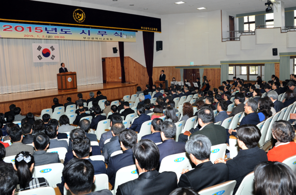부산시교육청(교육감 김석준)은 2일 오전 시교육청 대강당에서 전 직원이 참석한 가운데 을미년 새해 시무식을 갖고, 직원간 일일이 악수를 하며 덕담을 건네는 등 희망찬 새해 출발을 다짐했다. (사진제공=부산교육청)