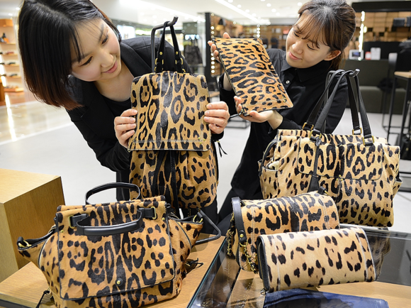 롯데백화점 부산본점 에비뉴엘관 1층 제롬드레퓌스 매장에서는 호피무늬가 새겨진 백팩, 클러치백, 지갑 등 다양한 디자인의 핸드백을 선보여 눈길을 끌고 있다. (사진제공=롯데백화점 부산본점)