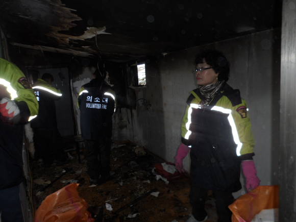 ▲▲인제 소방서 기린면 남·여 의용소방대는 6일 남·여 의용소방대장 등 10여 명이 참여해 화재 피해 가구의 주변 청소 및 정리정돈 등 봉사활동을 실시했다. (사진제공=인제소방서)