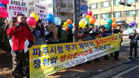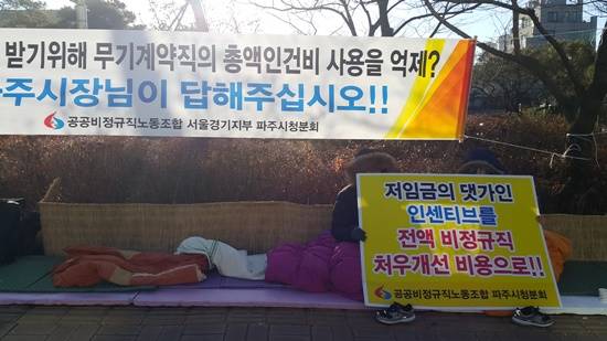 이들은 파주시가 총액인건비 대비 실제 인건비 예산책정률을 정규직은 90%인 반면, 무기계약직은 50%로 책정해 분명한 차별을 하고 있다며 수개월간 시청 앞에서 이재홍 파주시장의 면담을 요구하는 등 지속적인 문제제기를 해왔다.