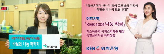 한편, 외환은행의 ‘KEB 1004 나눔 적금’은 저소득층과 사회소외계층의 목돈마련을 돕기 위한 사회공헌적 상품이다.
