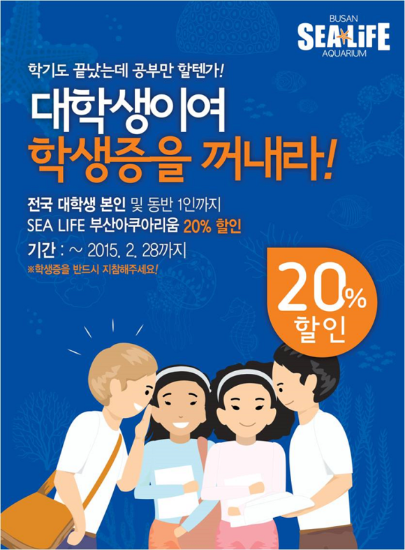 또한 겨울방학을 맞아 부산을 찾는 대학생들을 위한 할인 혜택도 추가로 마련됐다. 부산아쿠아리움을 방문하는 대학생들은 매표 시 학생증을 제시하면 본인과 동반 1인까지 20% 할인 혜택을 받을 수 있다.