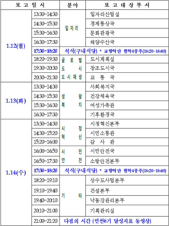 이번 업무보고는 각 실·본부·국별로 시장에게 보고하는 하향식의 비공개 업무보고라는 그간의 정형화된 방식에서 탈피해 기관(부서)간의 업무 공유·소통을 위해 시 본청 및 산하기관이 함께 모여 소관 실·본부·국장이 시장뿐 아니라 시민들에게도 보고하는 방식으로 전환한 것이 특징이다.