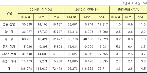섬유·신발업종은 신발 원부자재의 수출 증가와 고부가 섬유제품에 대한 수요 회복 등으로 내수(10.9%)와 수출(11.0%) 모두 두 자릿수 증가가 예상된다. 전자·전기업종도 선박용 및 고에너지효율 제품에 대한 수요 확대와 해외 발전설비 프로젝트 관련 부품의 수출 증가를 전망했다.