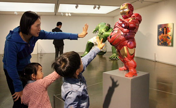 ▲신세계 센텀시티 갤러리를 방문한 가족고객들이 작품을 보며 흉내내고 있다. (사진제공=신세계 센텀시티)