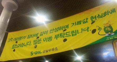 ▲매달 유류비 110만원을 지원받는 국회의원실 등을 상대로 최고가 배짱영업을 해왔던 국회앞 경일주유소는 비난여론이 계속되자 지난해 연말 사과문을 내걸고 가격을 크게 내렸다. 현재는 사과 프랭카드를 내린 상태다.