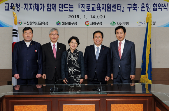 부산시교육청과 해운대구청, 사하구청, 사상구청, 기장군청은 14일 오후 시교육청 2층 전략회의실에서 부산 최초로 구축되는 ‘진로교육지원센터’ 4곳의 교육기부 협약을 체결했다. (사진제공=부산교육청)