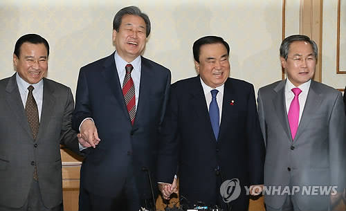 ▲지난해 12월 회동에 앞서 손을 맞잡고 있는 여야 지도부들. 새누리당 이완구 원내대표(왼쪽 부터), 김무성 대표, 새정치민주연합 문희상 비상대책위원장, 우윤근 원내대표.(자료사진=연합뉴스)