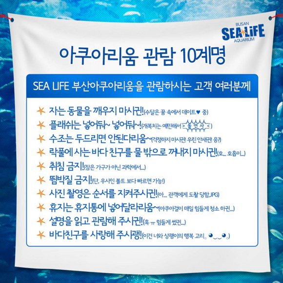 아쿠아리움 관람 10계명은 ▲플래시는 넣어둬~ 넣어둬~! (개복치는 예민해서 돌연사) ▲자는 동물을 깨우지 마세요! (수달은 꿈 속에서 데이트 중) ▲락풀에 사는 바다 친구를 물 밖으로 꺼내지 마세요! (호.. 호흡이...) 등 아쿠아리움 관람 시 해양동물을 위해 지켜져야 할 에티켓들을 토대로 작성됐다. 각 항목들은 누구나 이해하기 쉬운 일상 상황들로 재미있게 표현돼 눈길을 끈다.