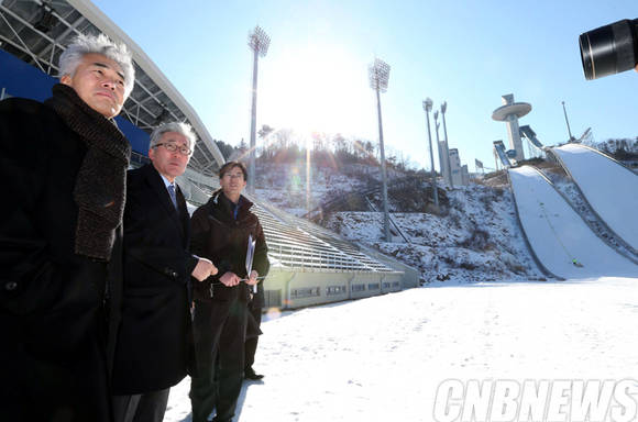 17일 김종덕 문화체육관광부 장관(좌측에서 두 번째)이 2018년도에 평창동계올림픽 경기가 열리는 강원도 평창 알펜시아 스키점프 경기장을 방문해 관계자들과 현장을 점검하고 있다. (사진=문화체육관광부)