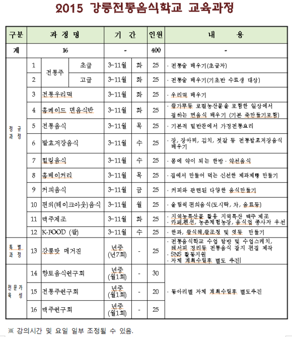 (CNB=최성락 기자) 강릉시 농업기술센터에서는 오는 3월부터 12월까지 '강릉전통음식학교' 12개 강좌를 이끌어 갈 뜻있고 실력 있는 강사를 공개 모집한다고 밝혔다.