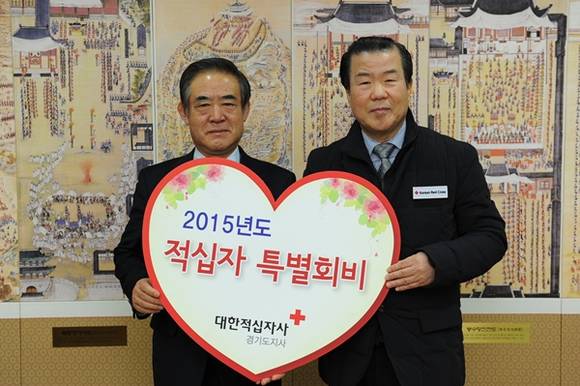 김진우 수원시의회 의장이 20일 김훈동 대한적십자사 경기도지사 회장에게 적십자 특별회비를 전달했다.