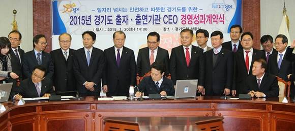 남 지사는 20일 도청 상황실에서 경기도 출자·출연기관 CEO 경영성과 계약식을 갖고 도 산하 출자·출연기관 등 공공기관장 26명에 대한 2015년도 경영성과 계약을 체결했다.