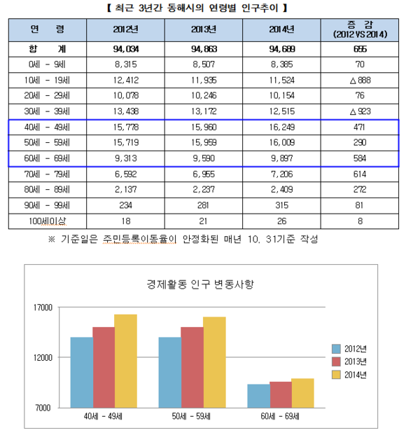 (CNB=최성락 기자) 동해시는 최근 3년간 주민등록인구 추이 자료에서 지역경제에 도움을 주고 있는 경제활동인구가 매년 증가하고 있는 것으로 나타났다고 밝혔다.